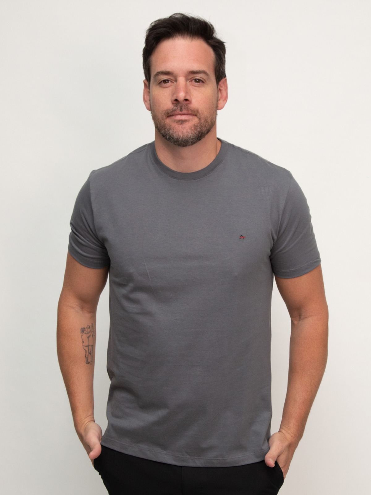 A Camiseta Básica Aramis é confeccionada em 100% algodão, oferecendo maciez, respirabilidade e caimento regular que proporciona conforto durante todo o dia. Possui gola careca clássica com acabamento reforçado e logo discreto bordado no peito.