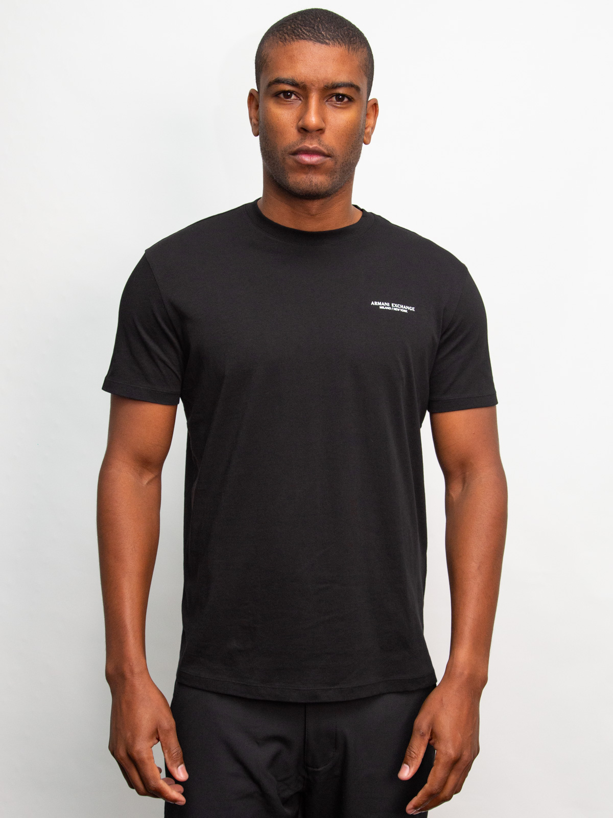 Seu caimento é ajustado ao corpo, sem apertar, valorizando a silhueta masculina. A estampa discreta com o logotipo Armani Exchange no peito reforça a identidade da marca com elegância e discrição.