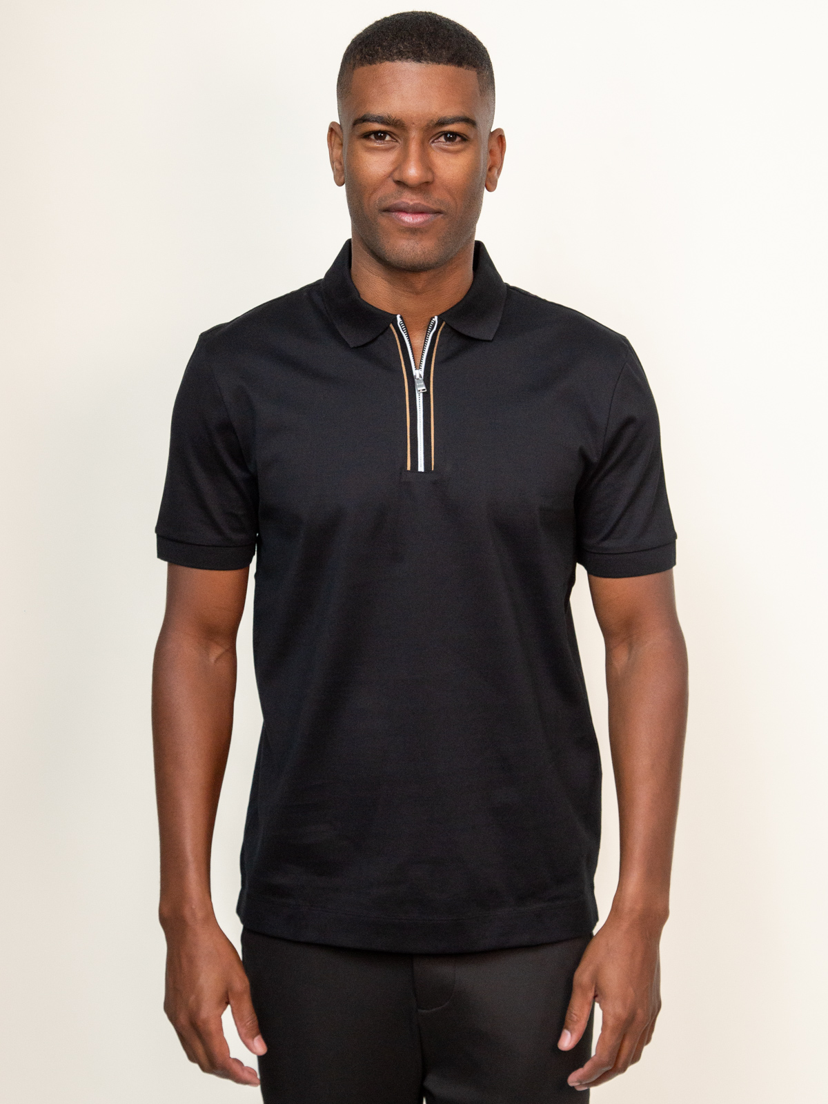 Com modelagem regular fit, a polo boss h-paras preta masculina entrega um caimento confortável e elegante. O destaque está na carcela com fecho de correr (zíper) e nas riscas de assinatura, que adicionam personalidade e um visual contemporâneo à peça. Ideal para composições modernas e sofisticadas.