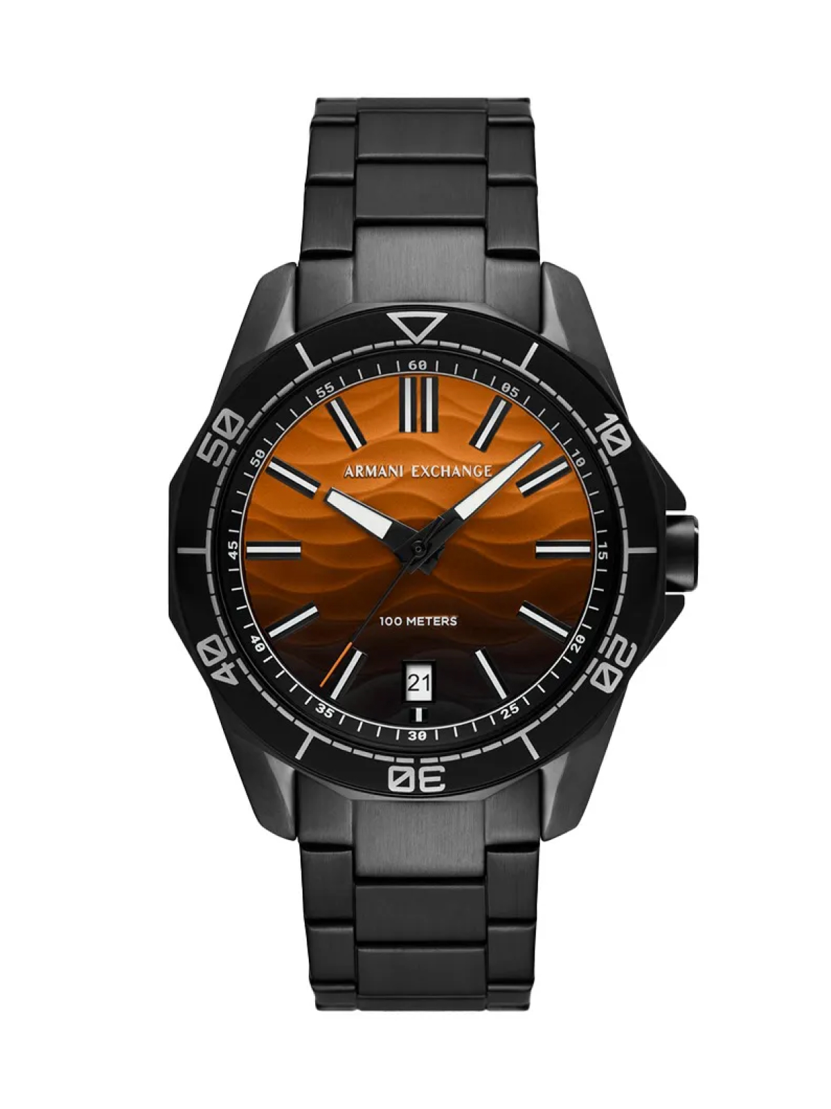 O Relógio Armani Exchange Quartz apresenta caixa e pulseira em aço inoxidável com acabamento preto, mostrador marrom degradê com textura sofisticada e design esportivo moderno, proporcionando resistência, estilo e excelente caimento no pulso.