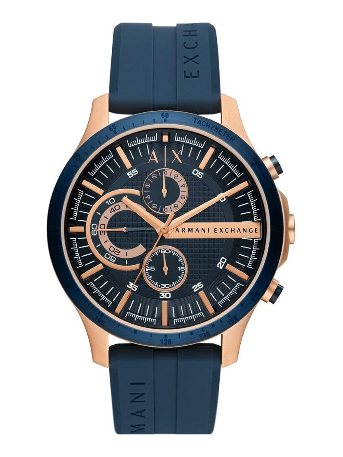 O Relógio Armani Exchange Chronograph combina caixa em aço inoxidável com acabamento azul e detalhes em rose, criando um visual moderno e sofisticado. Possui pulseira em silicone azul confortável, mostrador azul com elementos em rose e função cronógrafo com movimento quartzo de alta precisão, protegido por vidro em cristal mineral.