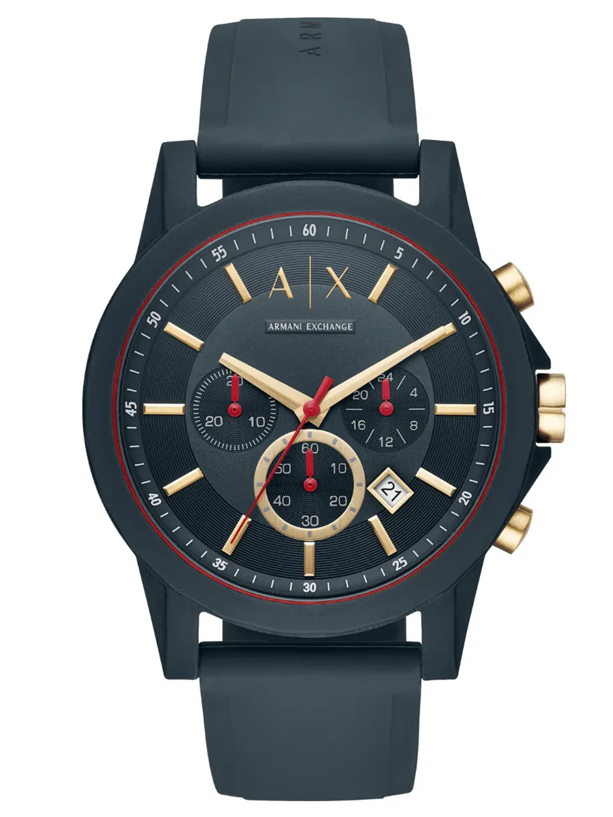 O Relógio Armani Exchange Chronograph possui caixa em aço com acabamento preto e pulseira em silicone, oferecendo visual moderno e presença marcante no pulso. Conta com mostrador preto, função cronógrafo, calendário e movimento quartz de alta precisão, protegidos por vidro em cristal mineral.
