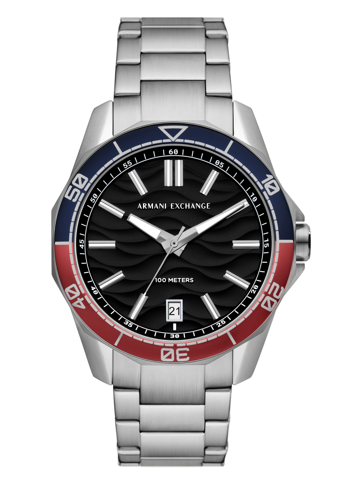 O Relógio Armani Exchange Quartz possui caixa e pulseira em aço inoxidável com acabamento prata, mostrador preto texturizado e aro bicolor em azul e vermelho, garantindo visual moderno, esportivo e excelente caimento no pulso.